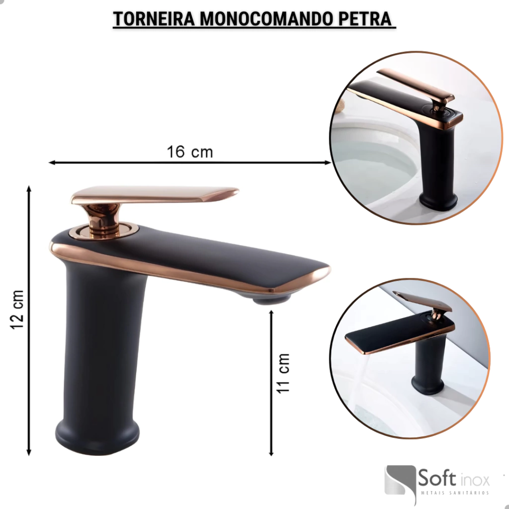 Um destaque de design e praticidade! A torneira combina o acabamento preto com detalhes em rose, perfeita para lavatórios modernos. Acompanha válvula click preta para maior sofisticação.