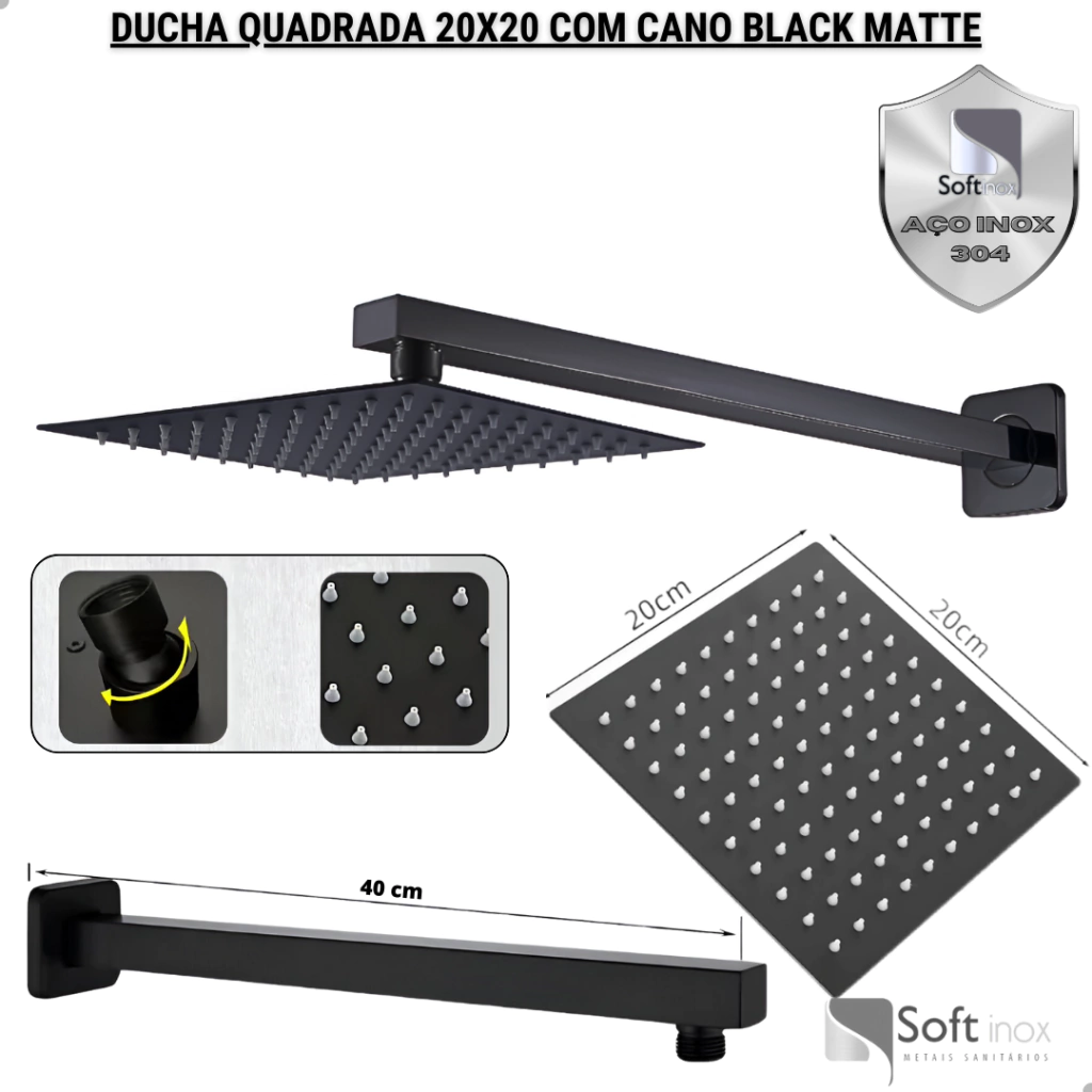 - Ducha Quadrada 20x20 com Cano Black Matte