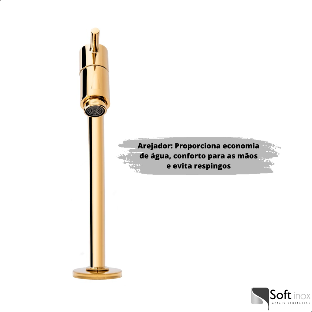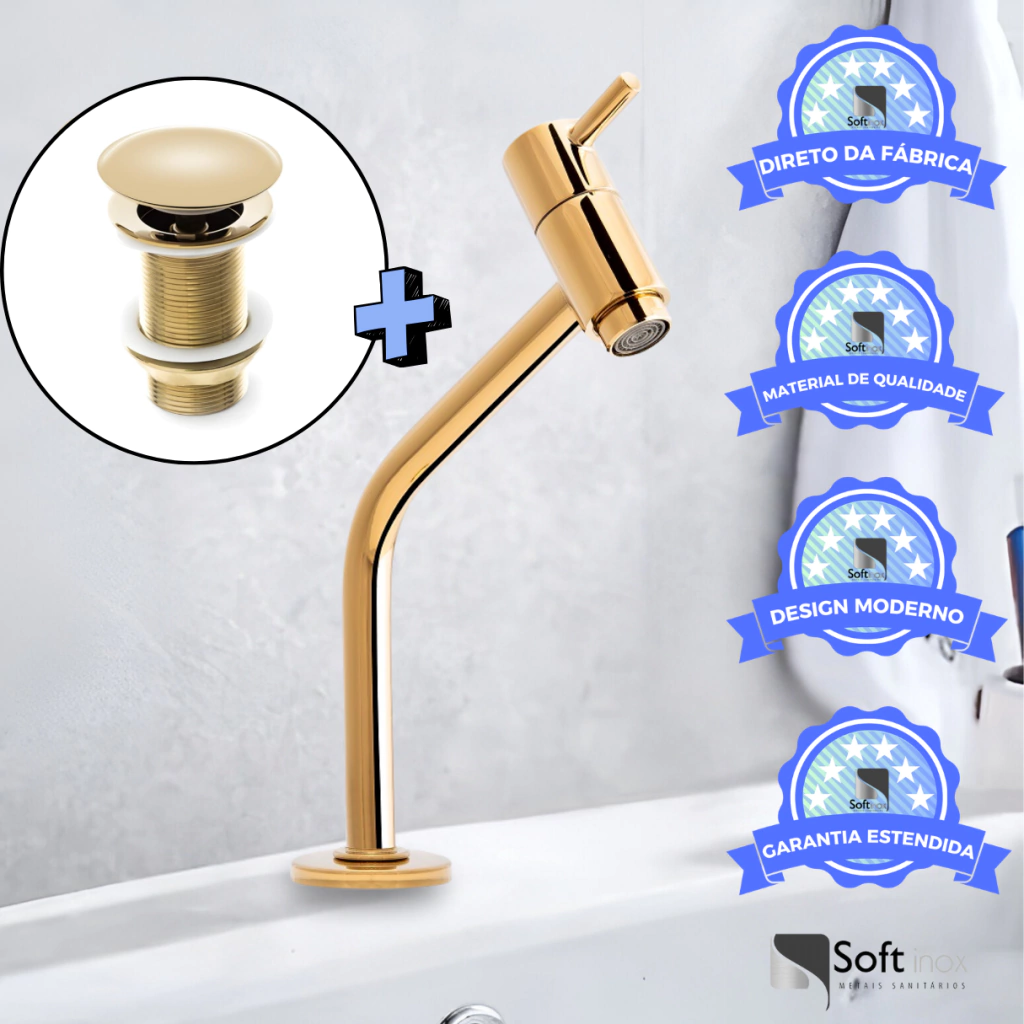 TAGS: Torneira, Lavatório, Bica Baixa, 1/4 de Volta, Dourado, Gold, Sofisticação, Durabilidade, Economia de Água, Válvula, Sistema Click, Dourado, 1.1/4, Drenagem, Cubas, Pias, Tanque, Metal, Durável, Resistente