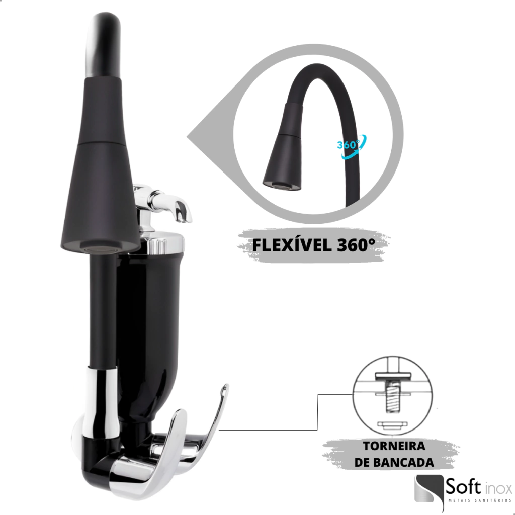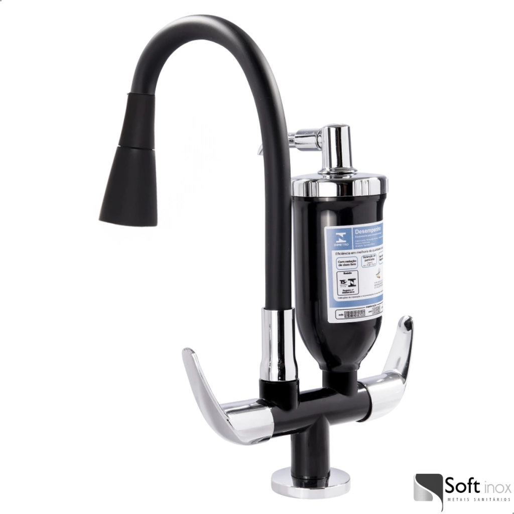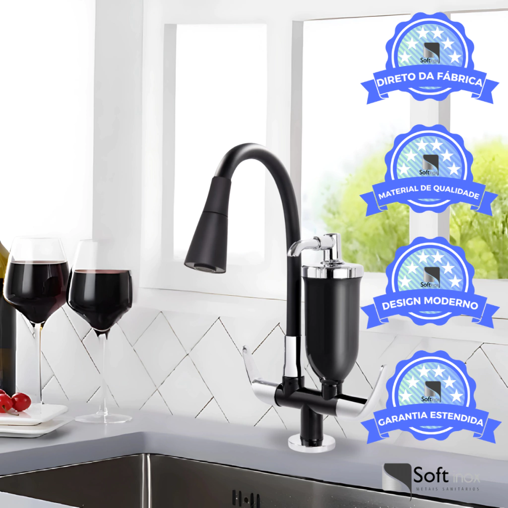 Transforme sua cozinha com a Torneira Gourmet Flexível Preta com Filtro de Água e garanta praticidade e elegância ao seu ambiente. Com design moderno, esta torneira une beleza, funcionalidade e a conveniência de água filtrada diretamente na sua pia.