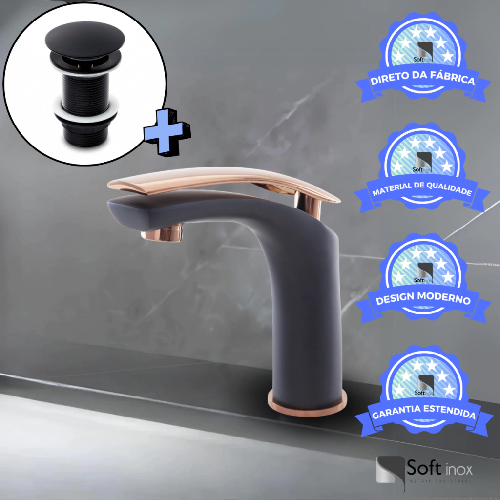 Adicione sofisticação e funcionalidade ao seu banheiro com o Kit de Torneira Monocomando Baixa e Válvula de Escoamento Click Luxo (Preto/Rose). Este conjunto combina o design elegante da torneira monocomando com a praticidade da válvula de escoamento, oferecendo uma solução completa para lavabos e banheiros modernos. A torneira possui acabamento em preto e rose, misturando requinte e durabilidade com o seu cartucho cerâmico de alta qualidade e controle preciso de vazão e temperatura. Já a válvula click em inox preto proporciona um toque luxuoso e praticidade com seu sistema inteligente de abertura e fechamento.
