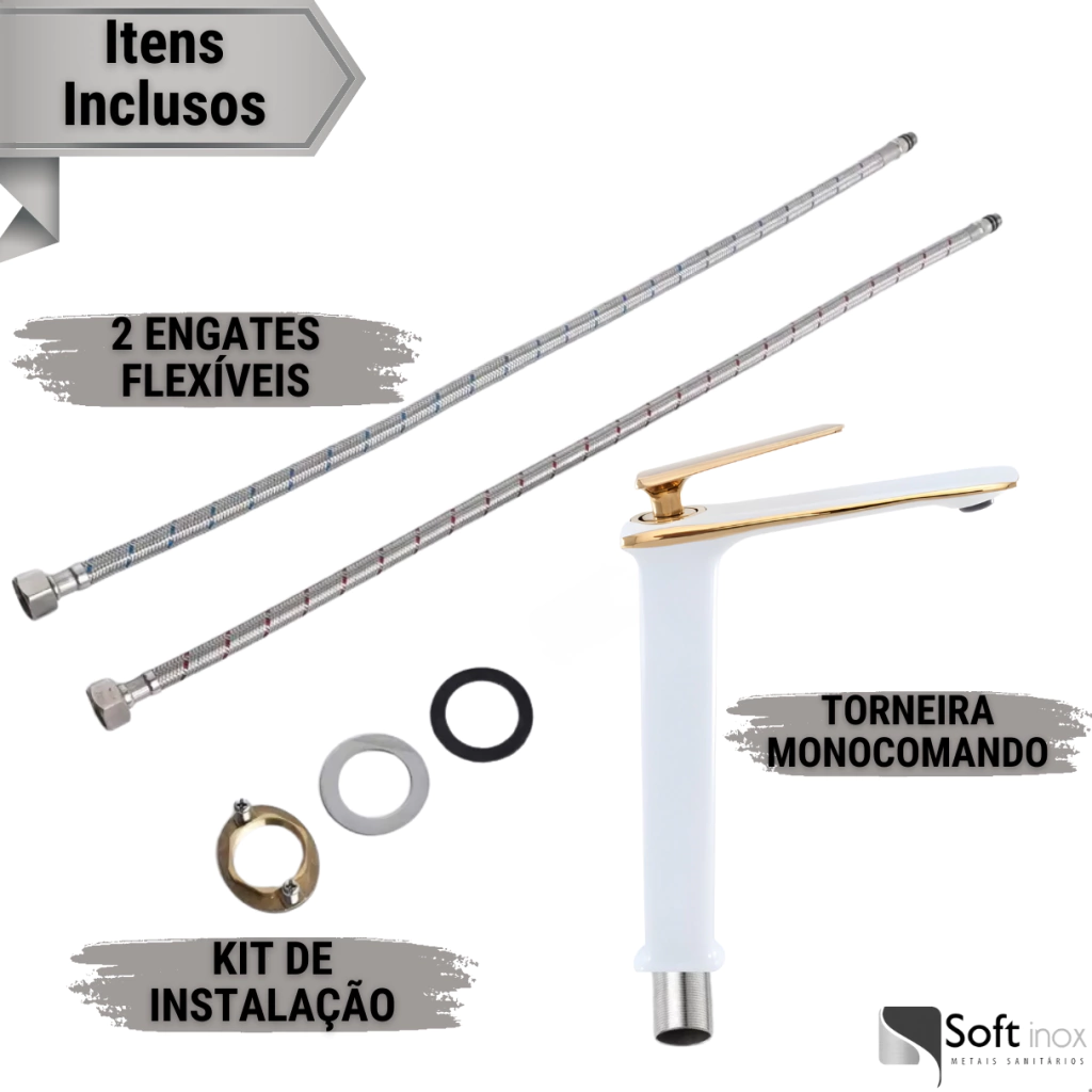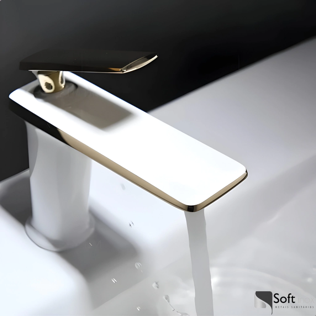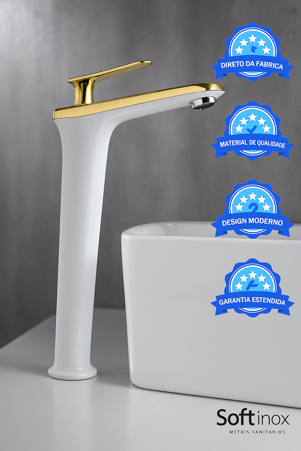 A Torneira Monocomando Rubi Alta na cor Branco/Dourado é uma peça luxuosa e exclusiva, projetada para lavatórios, que combina elegância e sofisticação. Fabricada com materiais de alta qualidade, esta torneira oferece durabilidade e resistência excepcionais, sendo totalmente em metal para garantir que não descasque nem oxide ao longo do tempo. Seu mecanismo de ¼ de volta proporciona maior economia de água, enquanto o arejador na bica evita respingos para os lados da cuba, mantendo a área seca e limpa. Com design de bica alta, esta torneira oferece praticidade e funcionalidade para o uso diário.